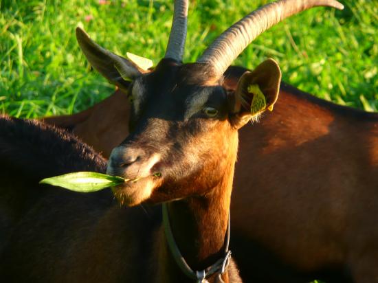 Le troupeau de chèvres du Domaine du Geissberg est composé d'environ 80 chèvres. La plupart d'entre elles sont de race "alpine-chamoisée" (brune à raie noire sur le haut du dos). Quelqu'autres, à la robe plus claire, viennent consteller de-ci de-là l'uniformité du troupeau alpin-chamoisé, par leur couleur crème, voire blanche. Chacune a son nom: Dordogne (la chef), Diva, Ellebore, ou encore Histoire, Himalaya, Jasmin, ou Framboise, ..., on se familiarise plus aisémént avec des noms qu'avec une boucle...